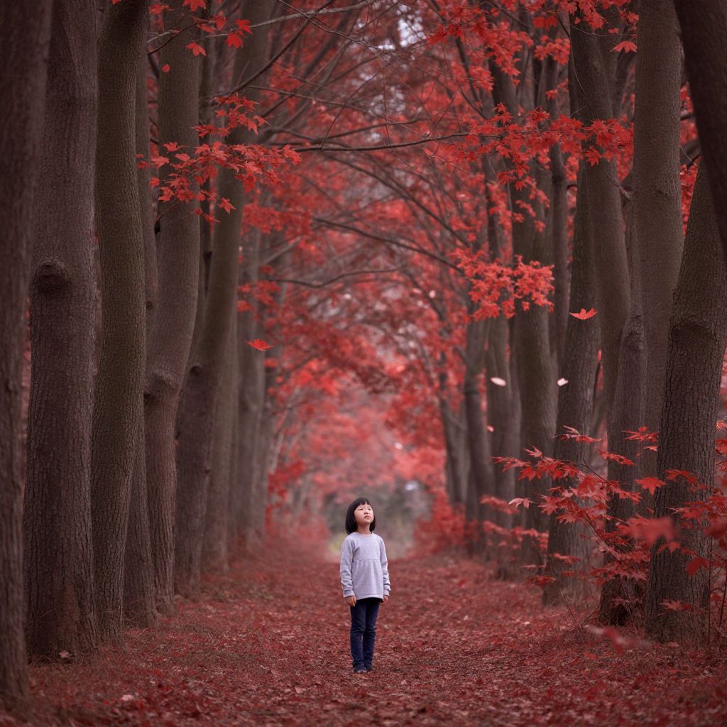Child stands alone amidst a vibrant forest path, surrounded by towering trees draped in crimson foliage, as delicate red leaves flutter gracefully around them, creating a serene and enchanting atmosphere.