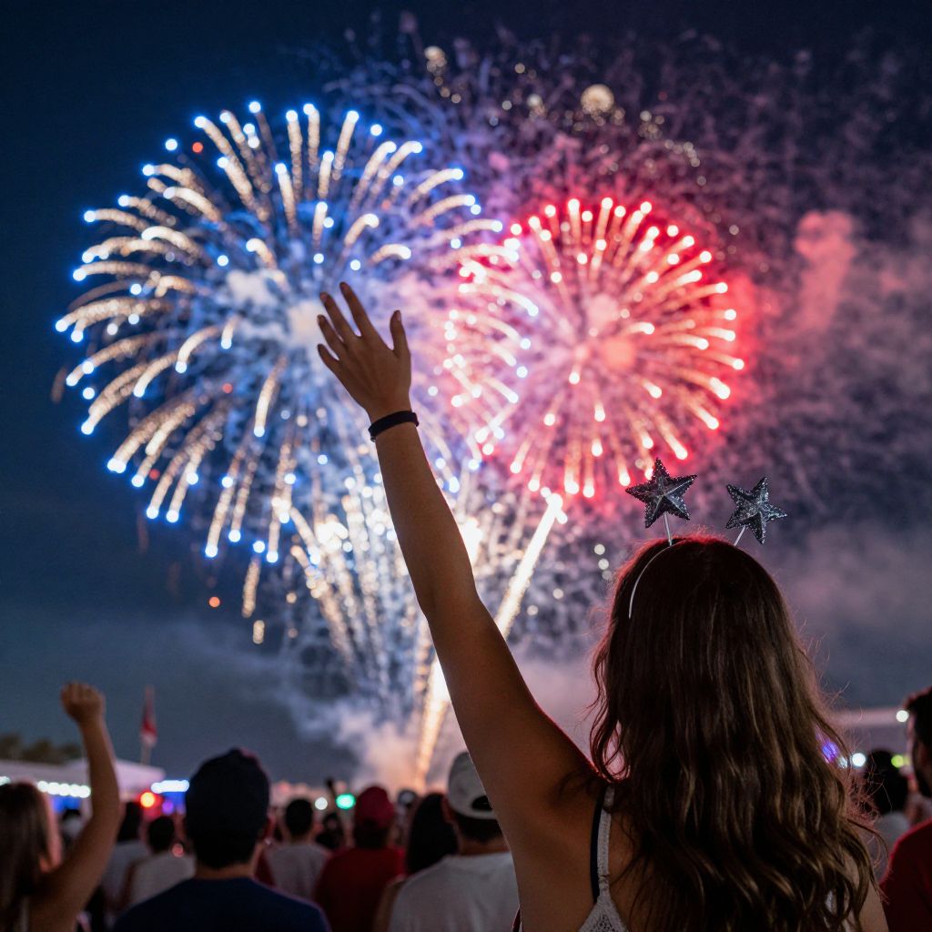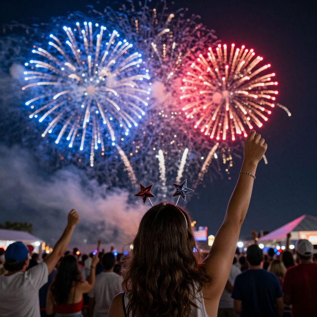 Festive fireworks explode in vibrant hues of blue and red above a crowd, as a woman adorned with a starry headband raises her arm in joyful celebration during a Fourth of July event.