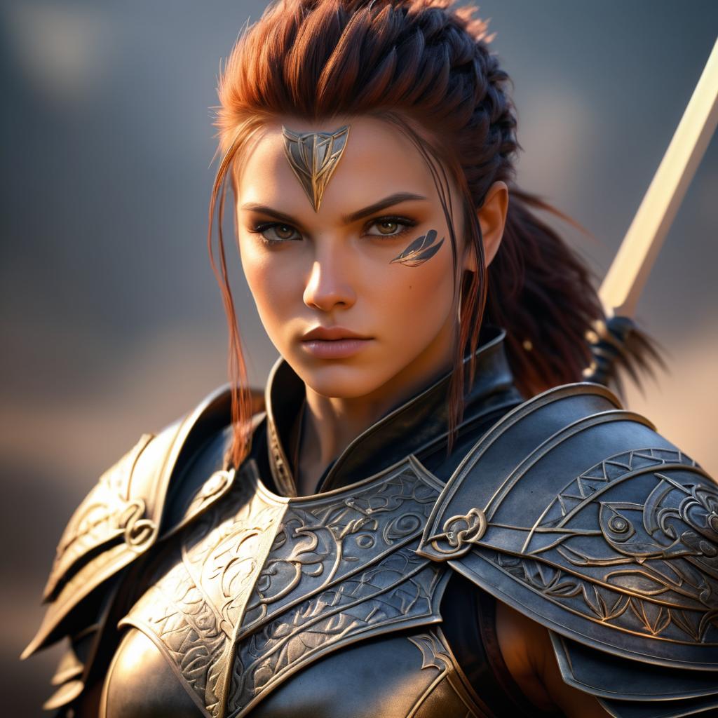 Portrait of a strong female warrior, styled as heroic fantasy concept art, detailed with sharp focus.