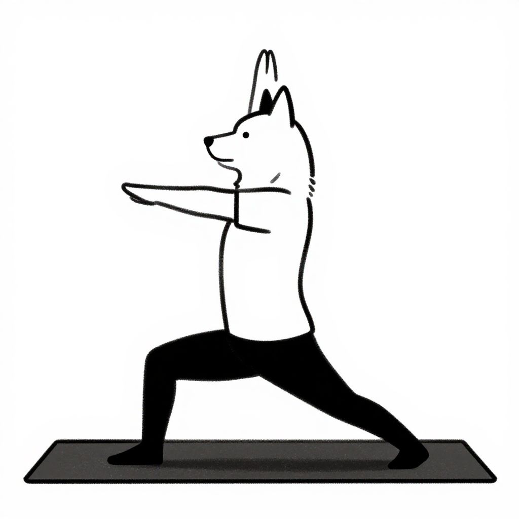 Black-and-white digital drawing of an anthropomorphic fox in a side lunge yoga pose, standing on a black mat.