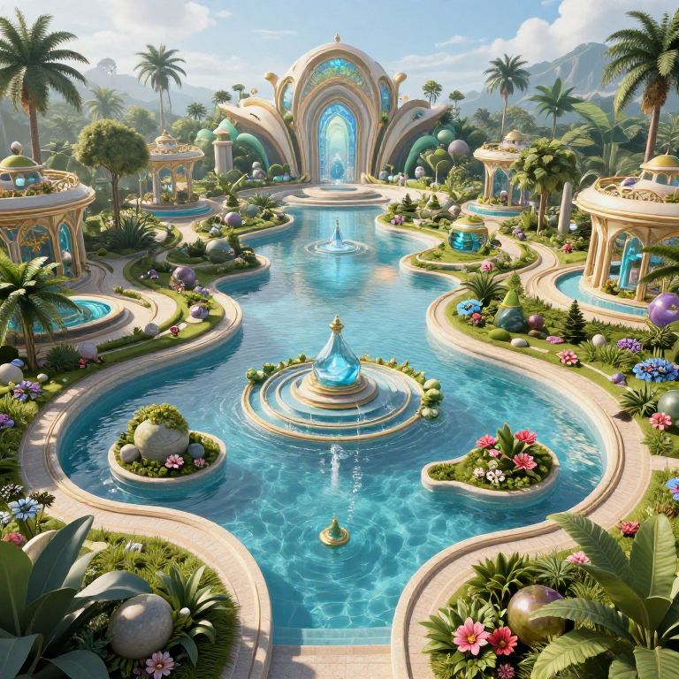 Uv Mapping magnificent utopian water garden, hd wallpaper, detailed, Unreal Engine, cinematic lighting,