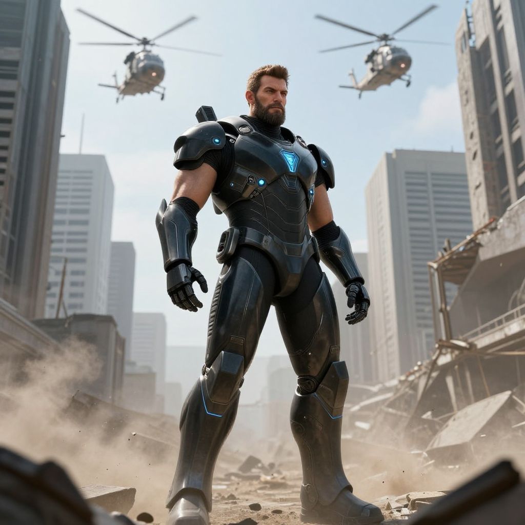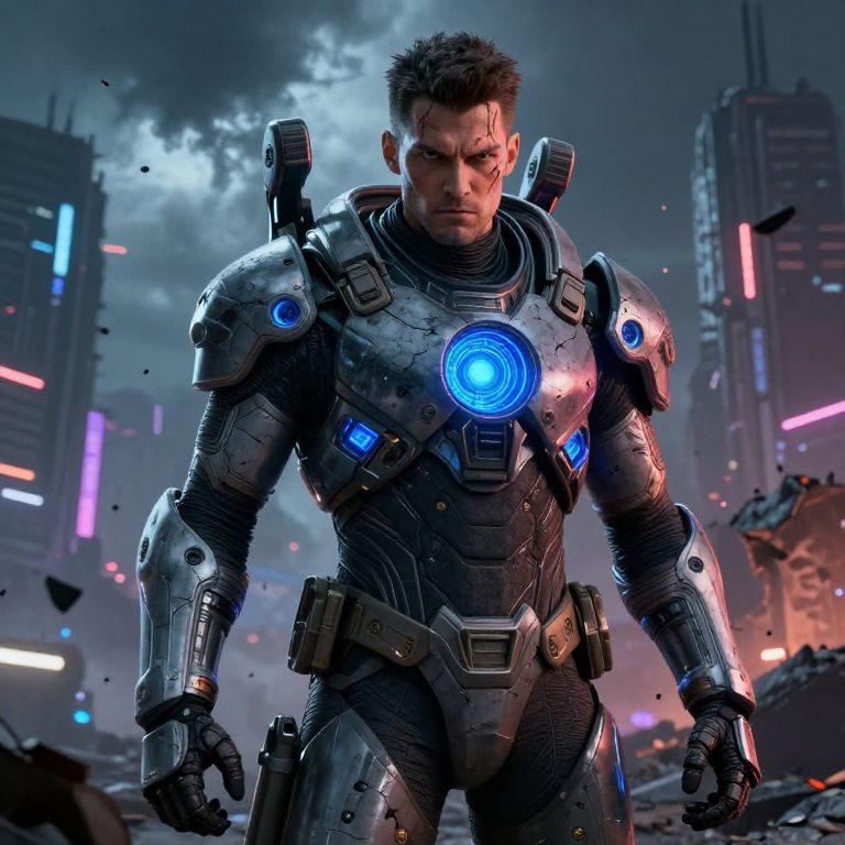 A high-resolution photography of a male sci-fi warrior with intense blue eyes, a shaved head, and a chiseled facial structure, crouched behind a ruined fortress wall, wearing a powered combat suit with glowing red and silver panels, in a desert wasteland lit by crimson sunsets and alien drones buzzing in the distance.