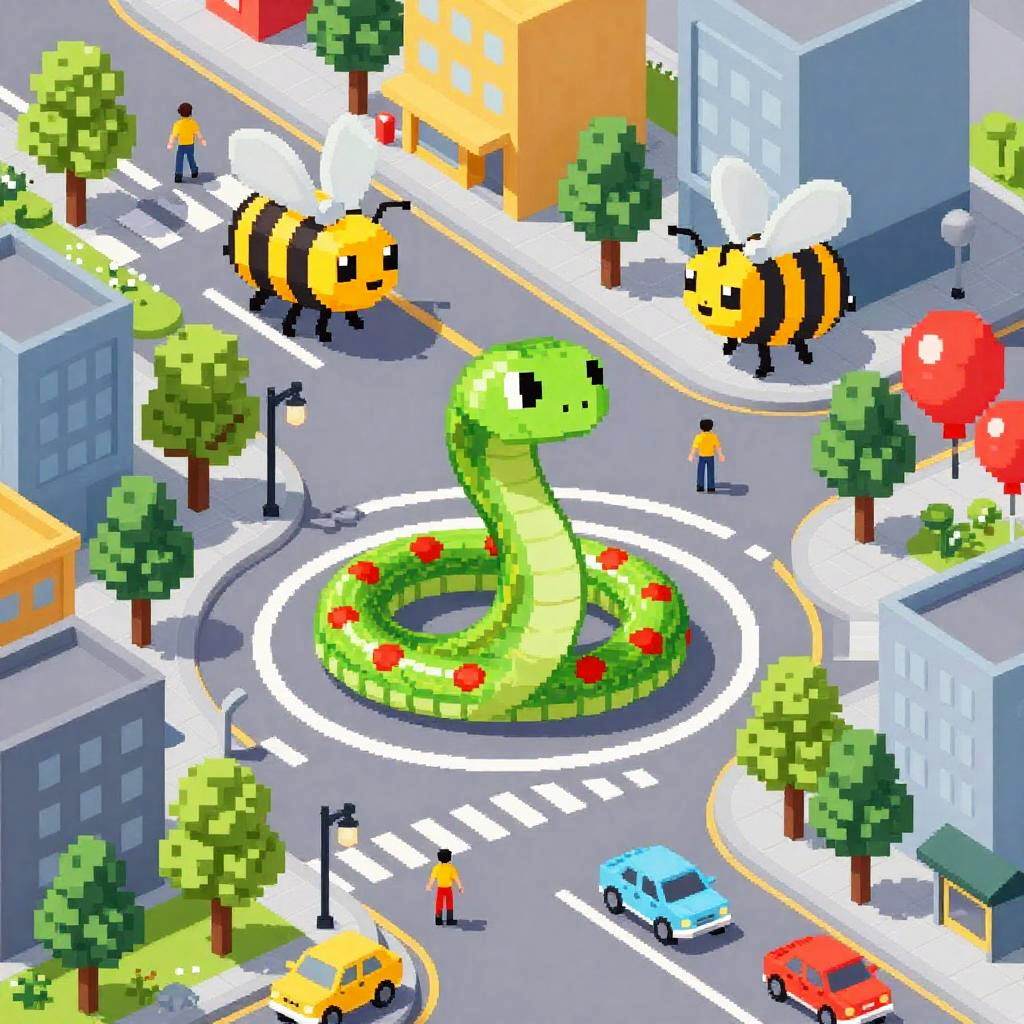 This is a vibrant, pixel art illustration of a bustling urban intersection. A large, green snake with a yellow underside and red flower accents coils in the center of the roundabout. Two cartoonish, bee-like creatures with black and yellow stripes and white wings hover above the snake and surrounding buildings. The intersection is surrounded by colorful buildings in shades of orange, blue, and gray. Trees with green foliage dot the scene, and several cars, including a blue and a red one, navigate the streets. Pedestrians, depicted as small pixelated figures, walk along the sidewalks. The overall style is reminiscent of classic 8-bit video game graphics, with bright, bold colors and simple, geometric shapes.