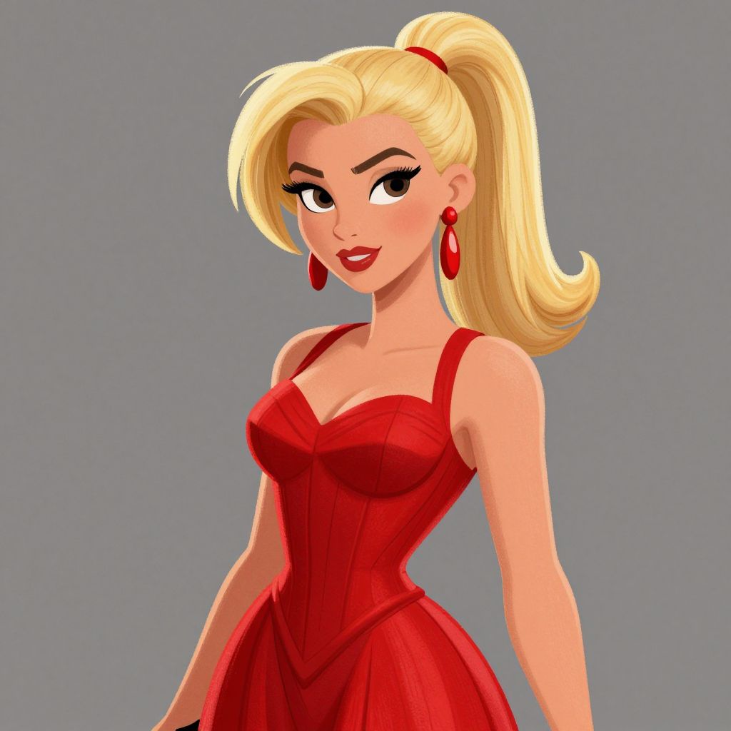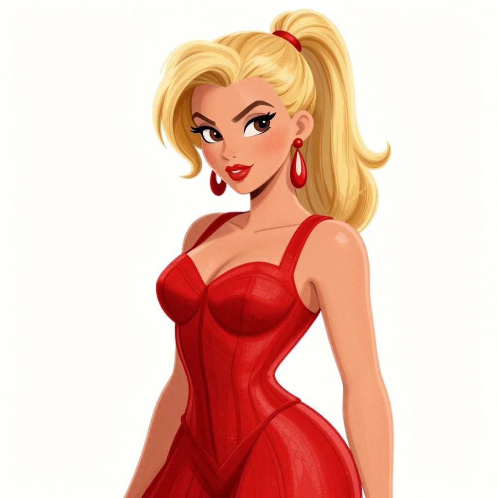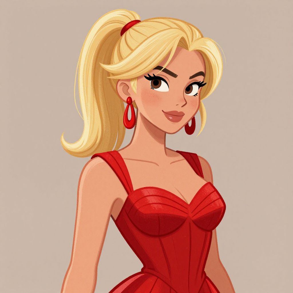 A vibrant digital illustration featuring a woman with striking blonde hair styled in a ponytail, adorned with bold red earrings, and wearing a form-fitting red dress with intricate pleats, showcasing a blend of cartoonish charm and detailed hand-painted textures reminiscent of Andrew Atroshenko's style.