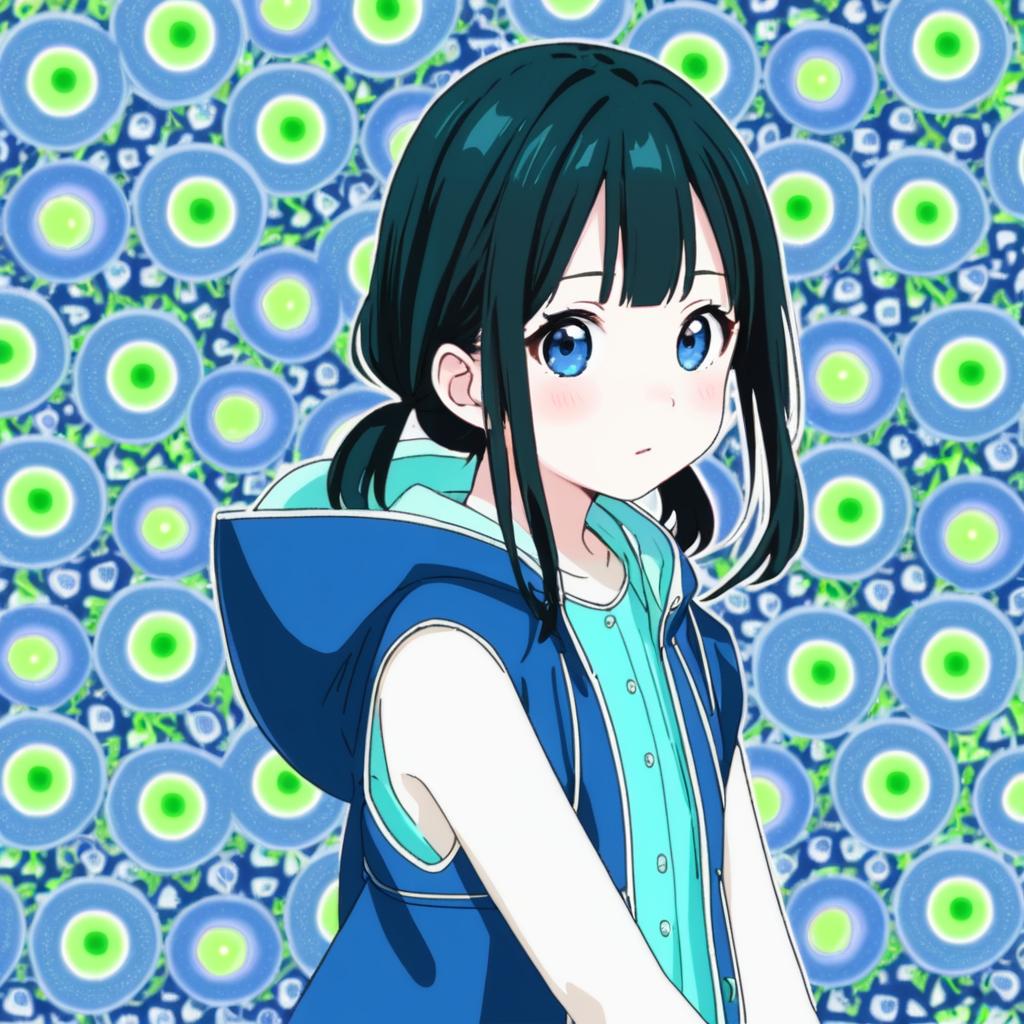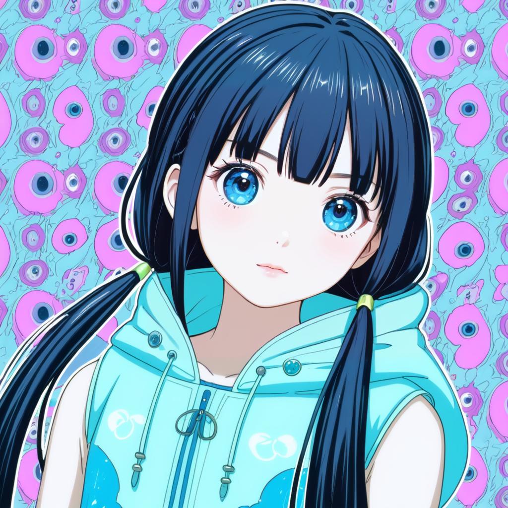 Anime-style portrait of a young girl with large blue eyes and long black hair styled in low twintails. She is wearing a sleeveless light blue hooded jacket with the hood down, exposing her bare arms. The background features a vibrant pattern of abstract, colorful shapes in pink and blue tones.