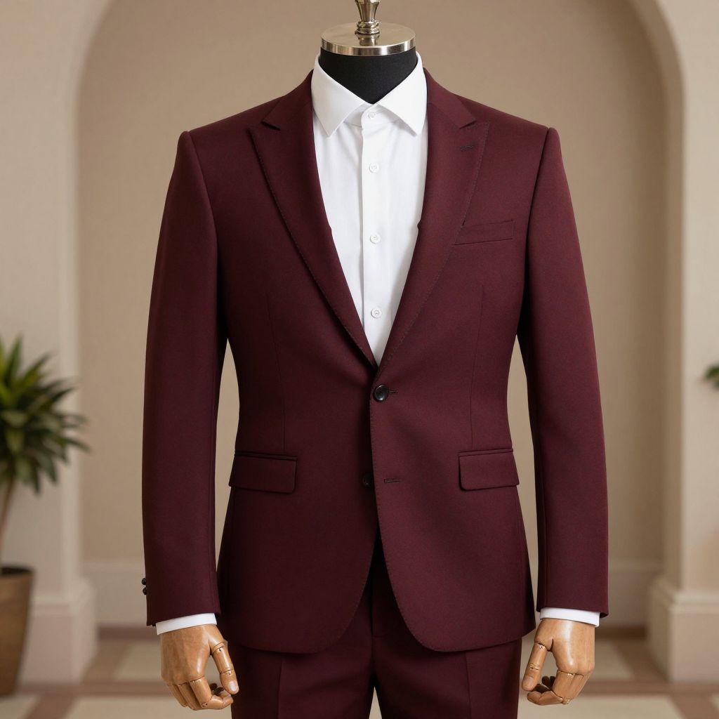 Photograph of a mannequin displaying a deep burgundy suit with a classic two-button jacket and matching trousers. The suit is paired with a crisp white dress shirt and a white tie. The mannequin has a metallic, headless neck. The background features a softly lit, arched hallway with beige walls and a potted plant to the left. The suit's fabric appears smooth and slightly glossy, with clean, sharp lines and a tailored fit. The overall style is formal and sophisticated.