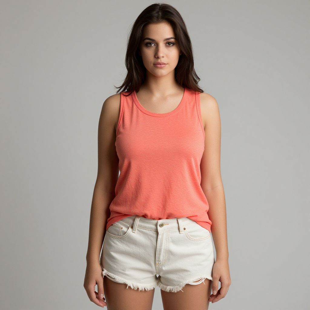 Photograph of a young woman with long, dark brown hair and fair skin, standing against a plain, light gray background. She wears a sleeveless, coral pink tank top and white, high-waisted denim shorts with frayed edges. Her expression is neutral, and she looks directly at the camera. The lighting is even, highlighting her natural features and the textures of her clothing. The overall style is casual and contemporary.