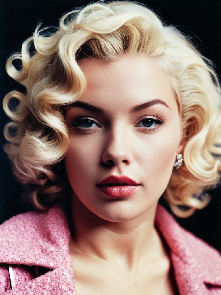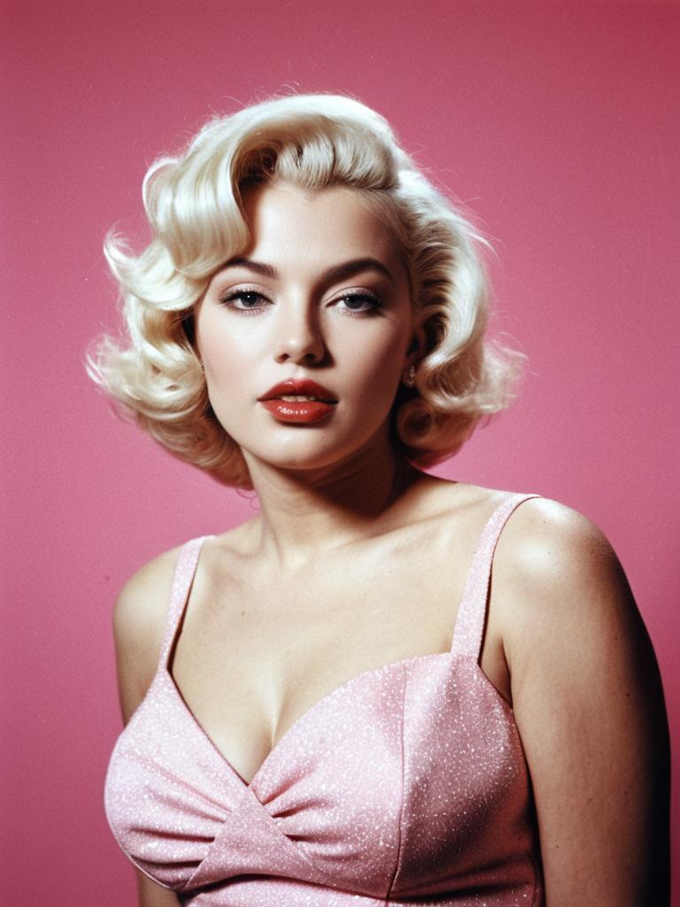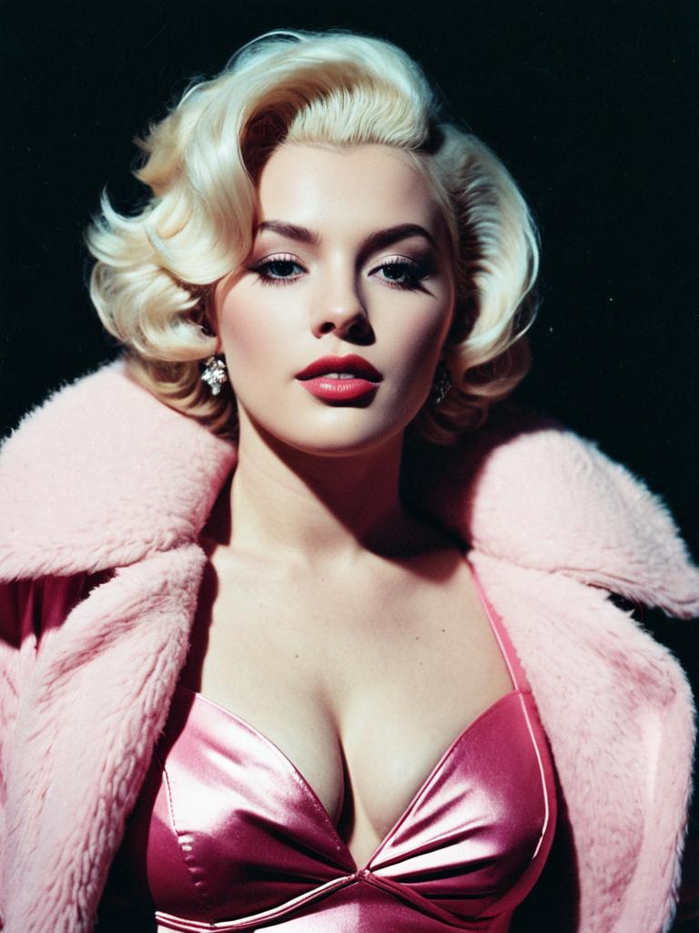 Candid portrait of a woman dressed in a glamorous pink satin dress styled after Marilyn Monroe's iconic look, featuring platinum blonde curls, vintage makeup, red lipstick, and a sparkling pearl choker necklace. She is attending a retro-themed event with people in formal and semi-formal attire in the background.