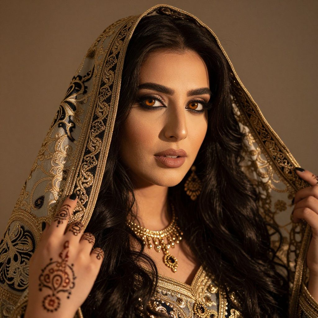 Photograph of a beautiful South Asian woman with long black hair, wearing an ornate gold and black veil, intricate henna on her hand, and