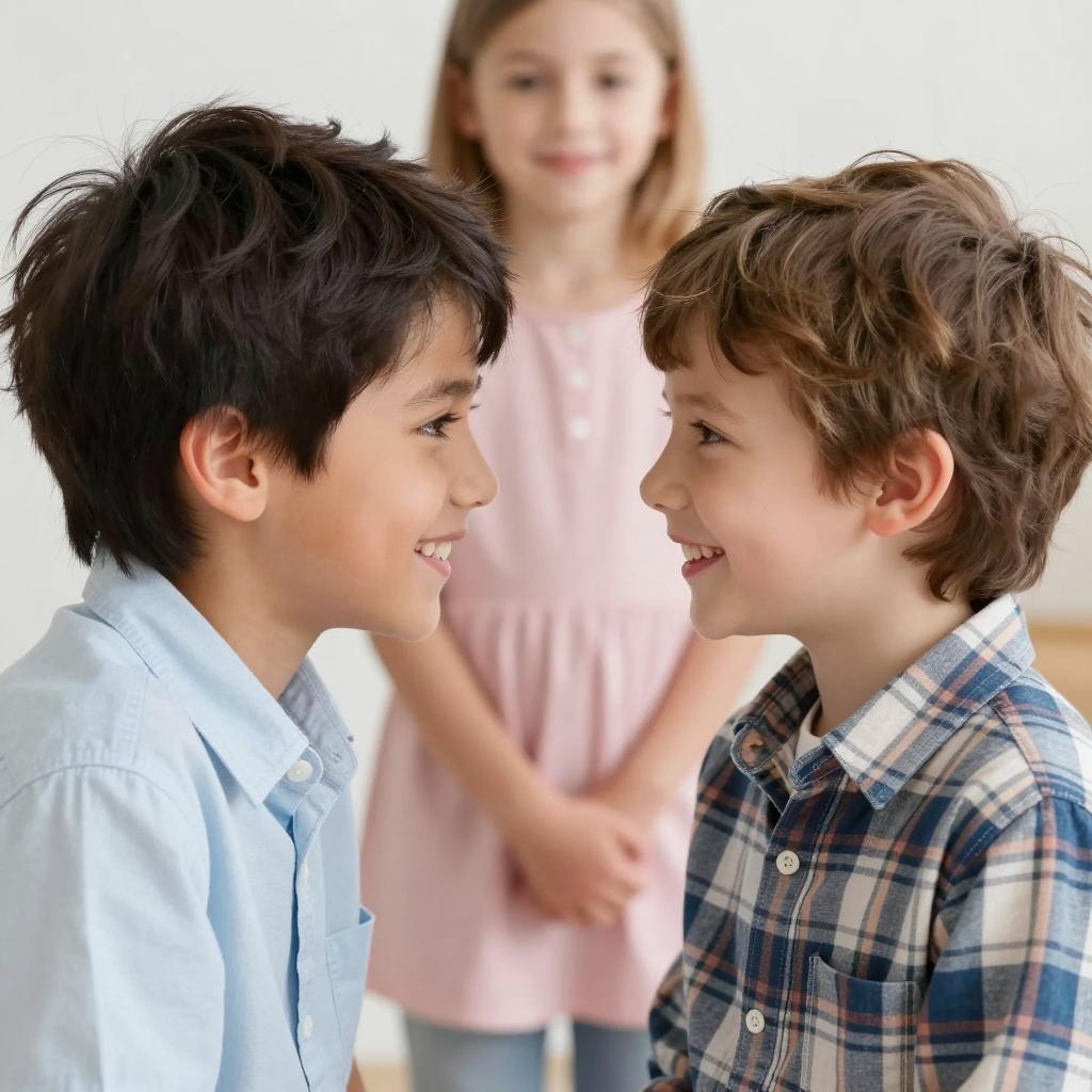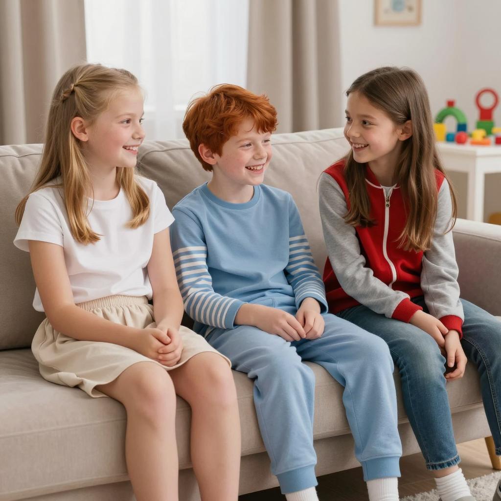 Young girl with light brown hair, wearing a white short-sleeve shirt and shorts, stands barefoot in front of a full-length mirror. Her reflection shows a neutral expression. Room has peach-colored wallpaper, wicker chair with white lace cover, closed white double doors, and a grand piano on the right. Padded stool with gold and black upholstery is next to the piano. Light from the mirror highlights her back.