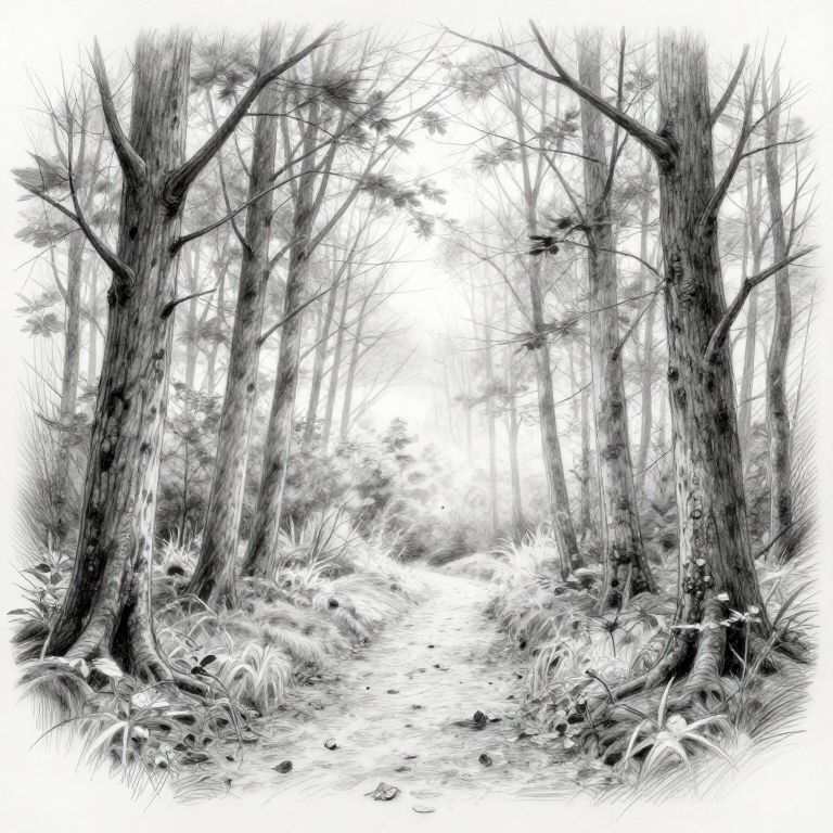 Sketch reference of a serene forest scene at dawn, delicate pencil lines capturing tall trees, winding path, scattered leaves, and soft light filtering through branches, realistic anatomy and perspective study, monochrome style, high detail.