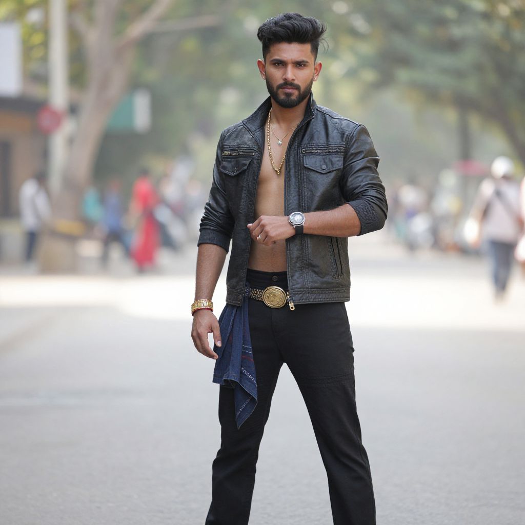 Photograph of a handsome young man with a well-groomed dark beard and short, styled black hair, standing confidently on a sunlit street. He wears a black leather jacket, open to reveal a bare, muscular chest, and black pants with a gold belt buckle. He has gold necklaces and a wristwatch. His left hand holds a blue cloth, while his right hand is raised slightly. The background is blurred, showing a few people and trees, with sunlight filtering through. He exudes a stylish, modern look.