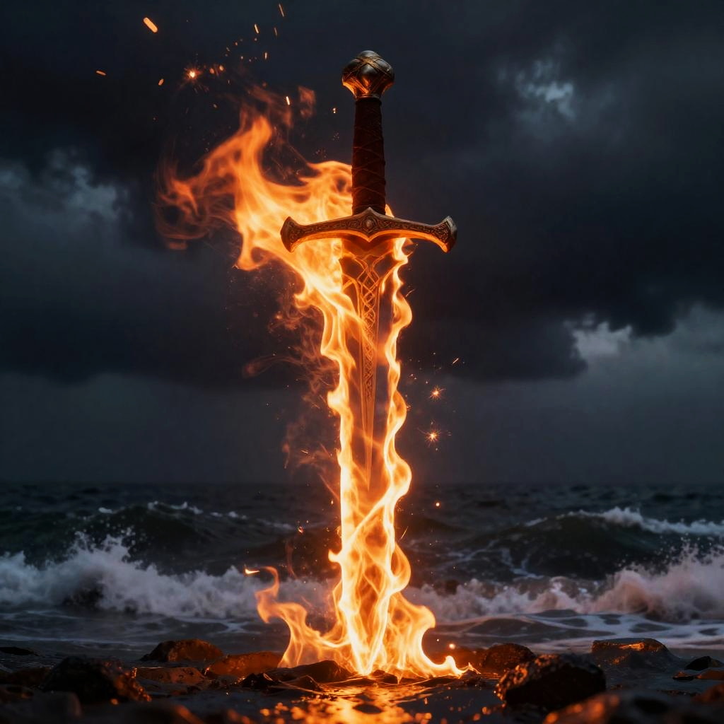 Realistic Flaming Sword Over Stormy Sea
