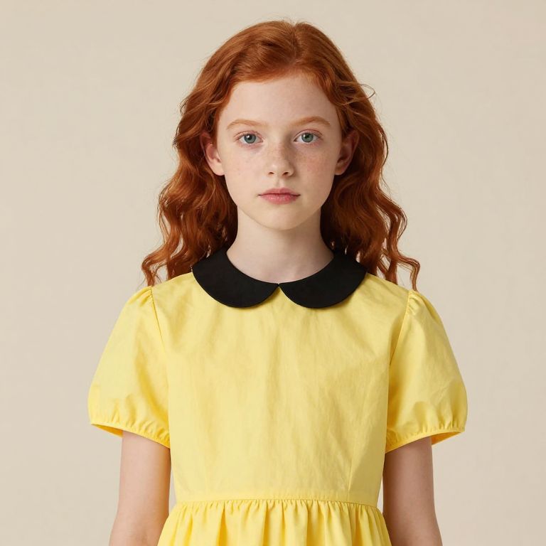Photograph of a young Caucasian girl with fair skin and long, wavy red hair. She has blue eyes and a neutral expression. She is wearing a bright yellow dress with short sleeves and a black Peter Pan collar. The dress has a subtle waistline. The background is a plain, light beige color, making the girl the focal point of the image. The lighting is even, highlighting her freckles and natural complexion. The image has a clean, studio-quality feel.