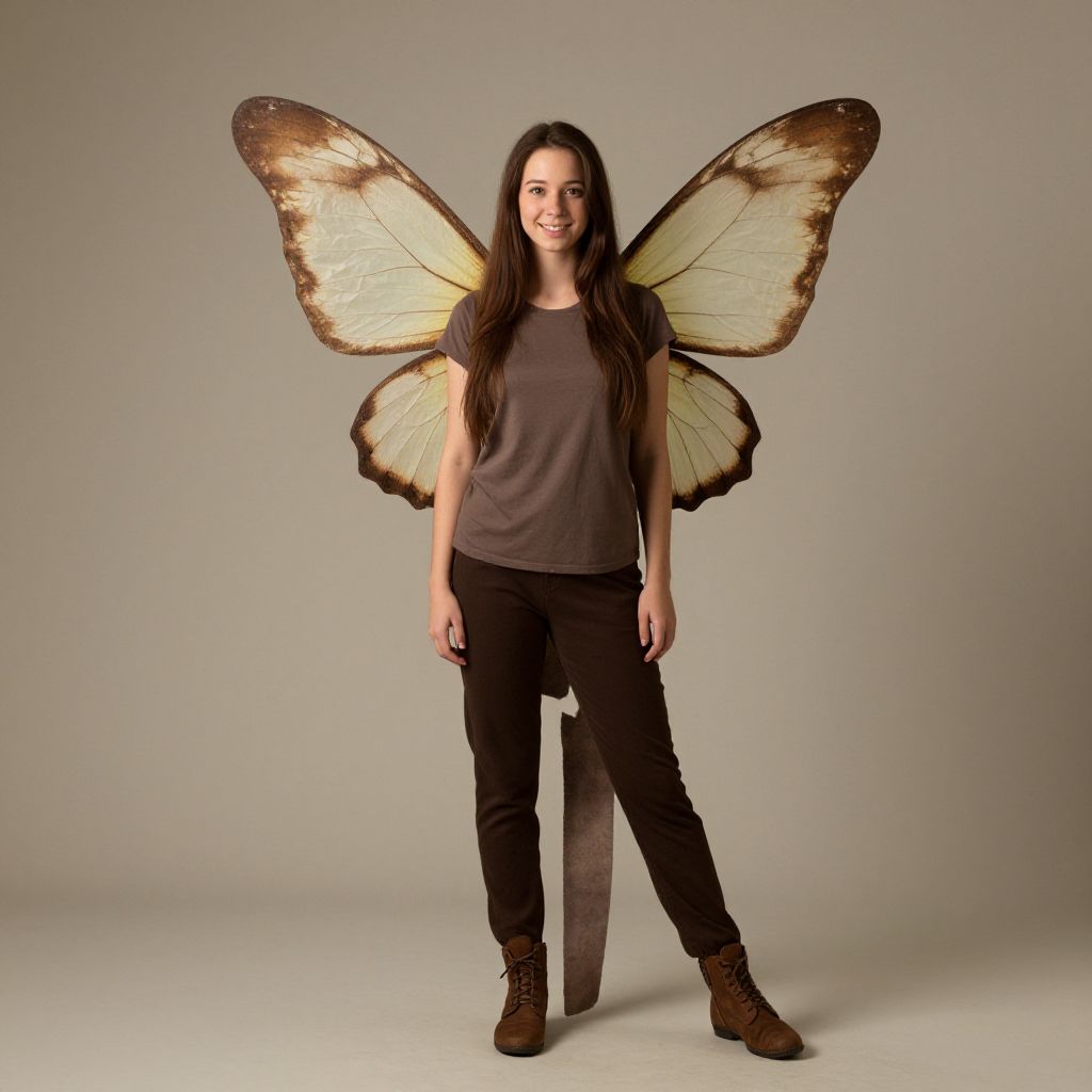 Pixie wings costume, 1girl, solo, wings, long hair, insect wings, brown hair, pants, shirt, full body, fairy wings, brown footwear, fairy, brown shirt, simple background, standing, smile, butterfly wings