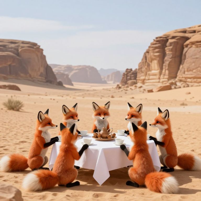 Six anthropomorphic foxes gather around a table draped in a pristine white cloth, enjoying a communal tea party in the midst of a vast desert landscape, surrounded by towering rock formations under a serene sky.