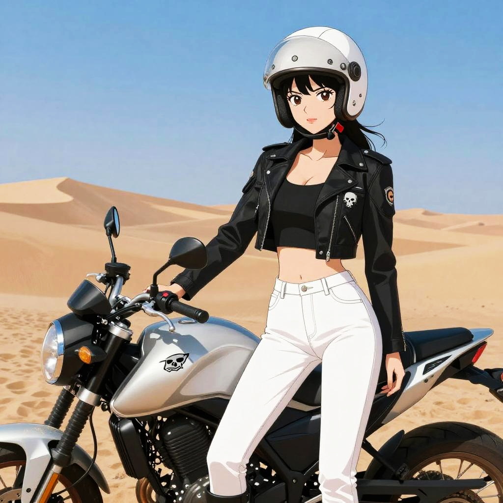 Rebellious Biker Anime Woman in Desert