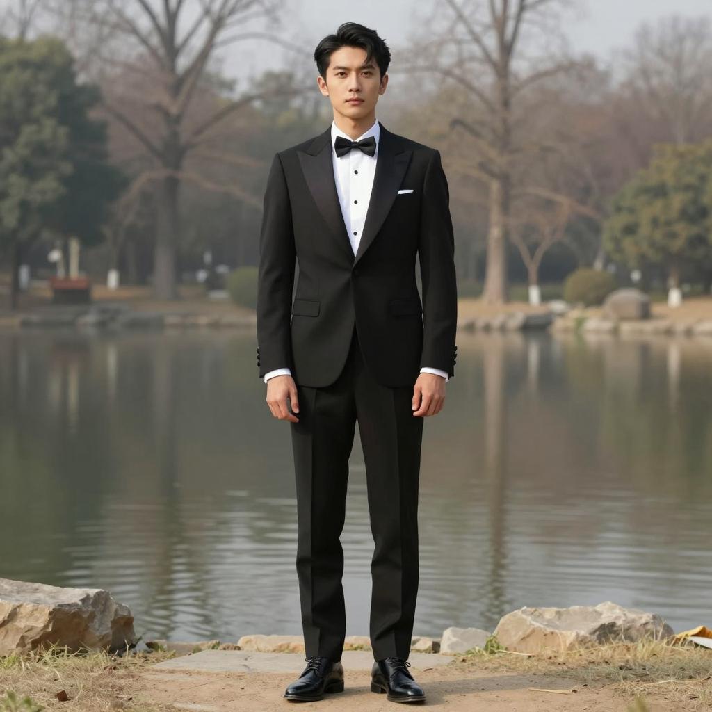 A man dressed in a classic black tuxedo stands confidently by a serene lake, surrounded by a backdrop of bare trees. The setting exudes a timeless and sophisticated style, perfect for formal occasions.