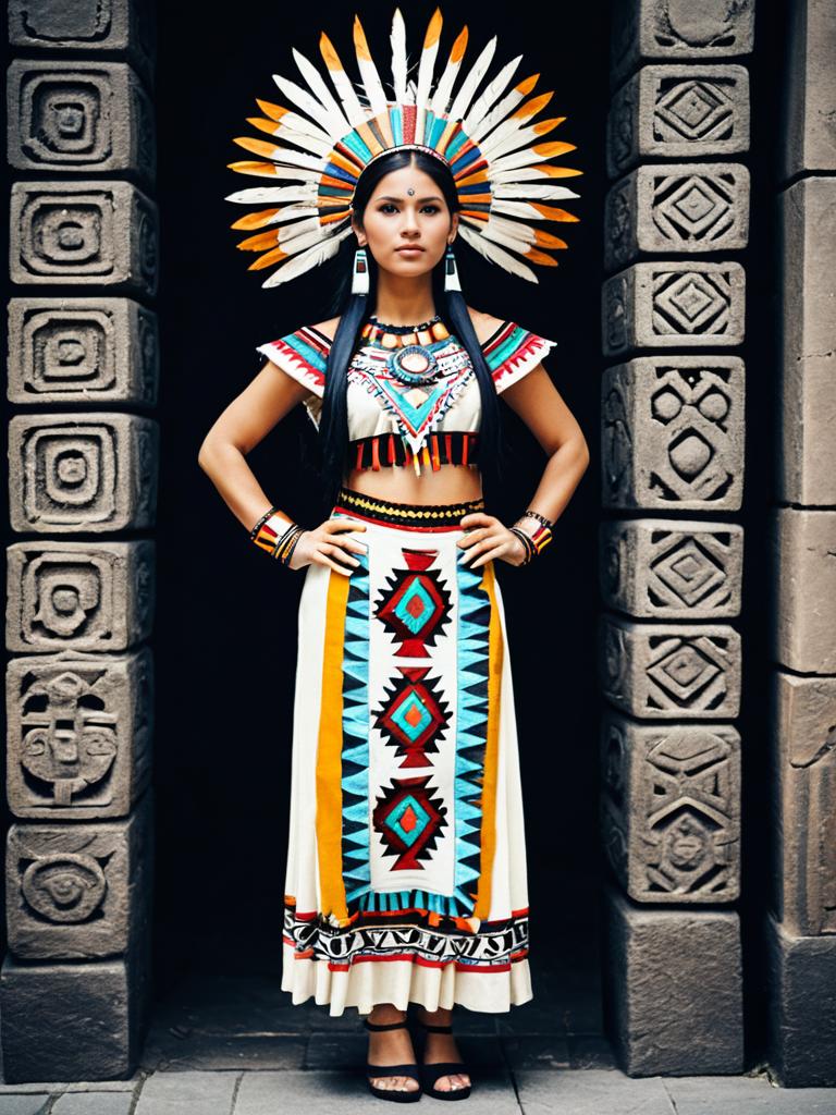 Woman in Aztec Princess Dress costume, full-body cosplay photo, photorealistic style