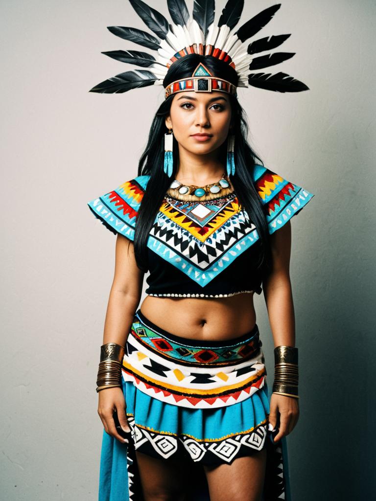 Photograph of an Asian woman in traditional Aztec-inspired attire, featuring a colorful dress, feather headdress, and ornate jewelry, standing against a