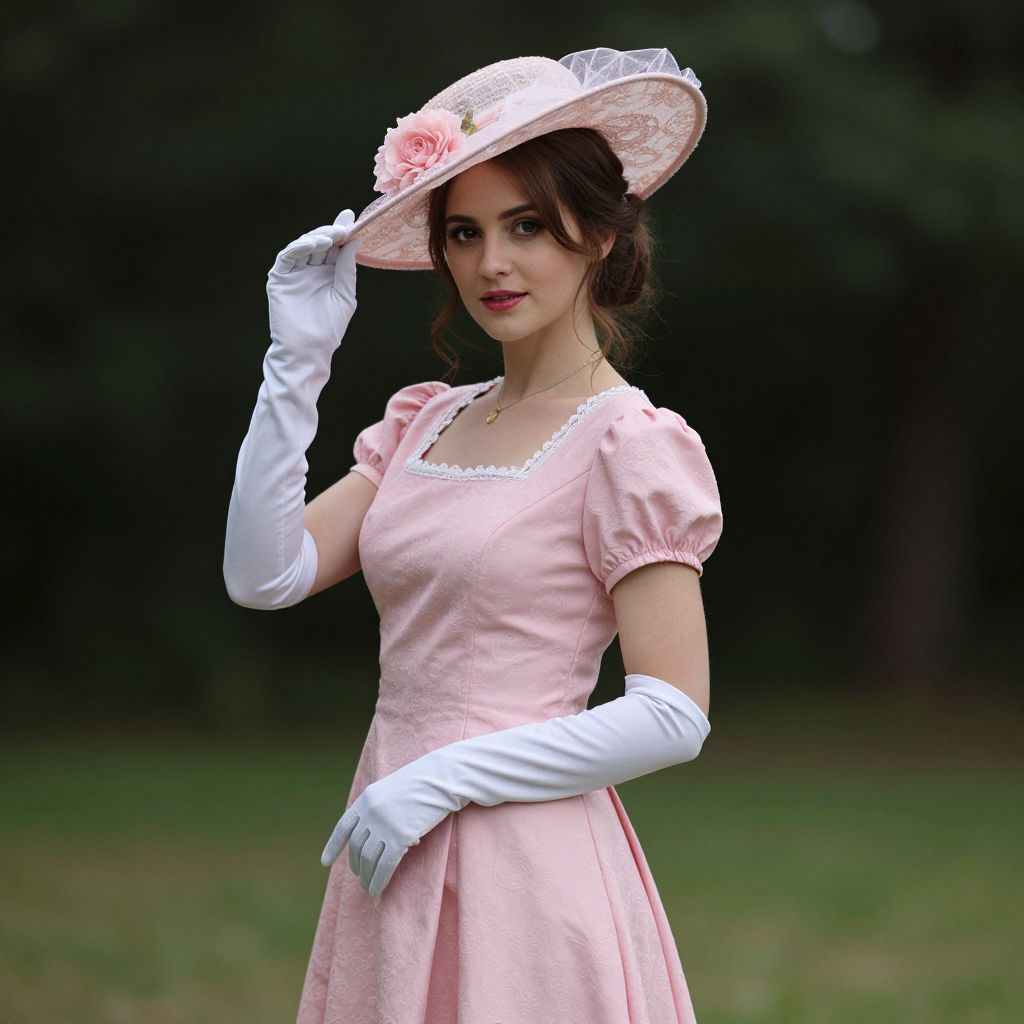 Photograph of a young woman standing outdoors in a lush, green park. She has fair skin, dark brown hair styled in an updo, and wears a light pink, Victorian-style dress with short puffed sleeves and a lace-trimmed neckline. She pairs the dress with long, white opera gloves and a white lace hat adorned with a pink rose. She holds the hat's brim with her right hand, her left hand resting on her hip. Her expression is calm and slightly smiling. The background is softly blurred, emphasizing her elegant attire. The overall style evokes a vintage, Edwardian era aesthetic.