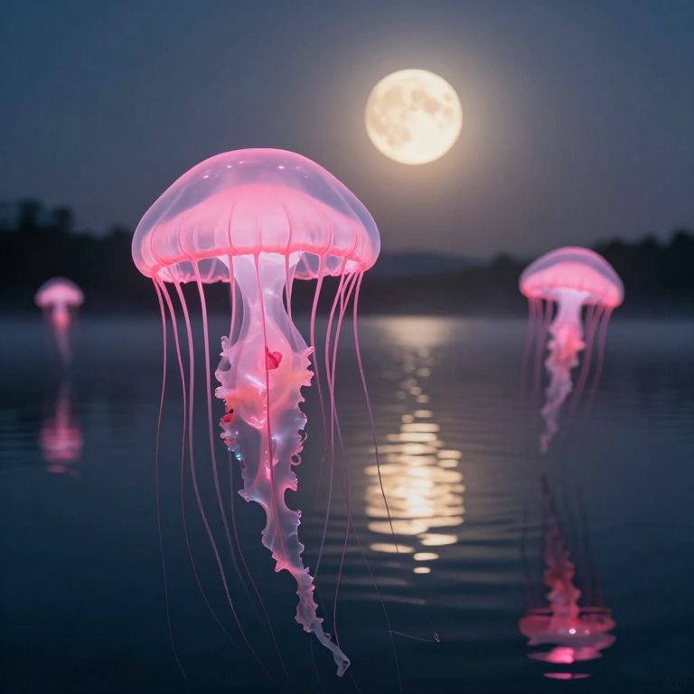 Glowing pink jellyfish-like structures float serenely above a tranquil water surface, their translucent tendrils cascading down like ethereal ropes, illuminated by a radiant full moon casting a warm glow over the misty landscape.