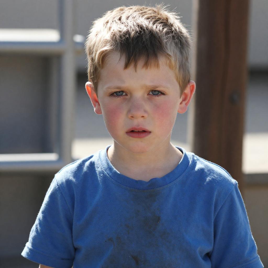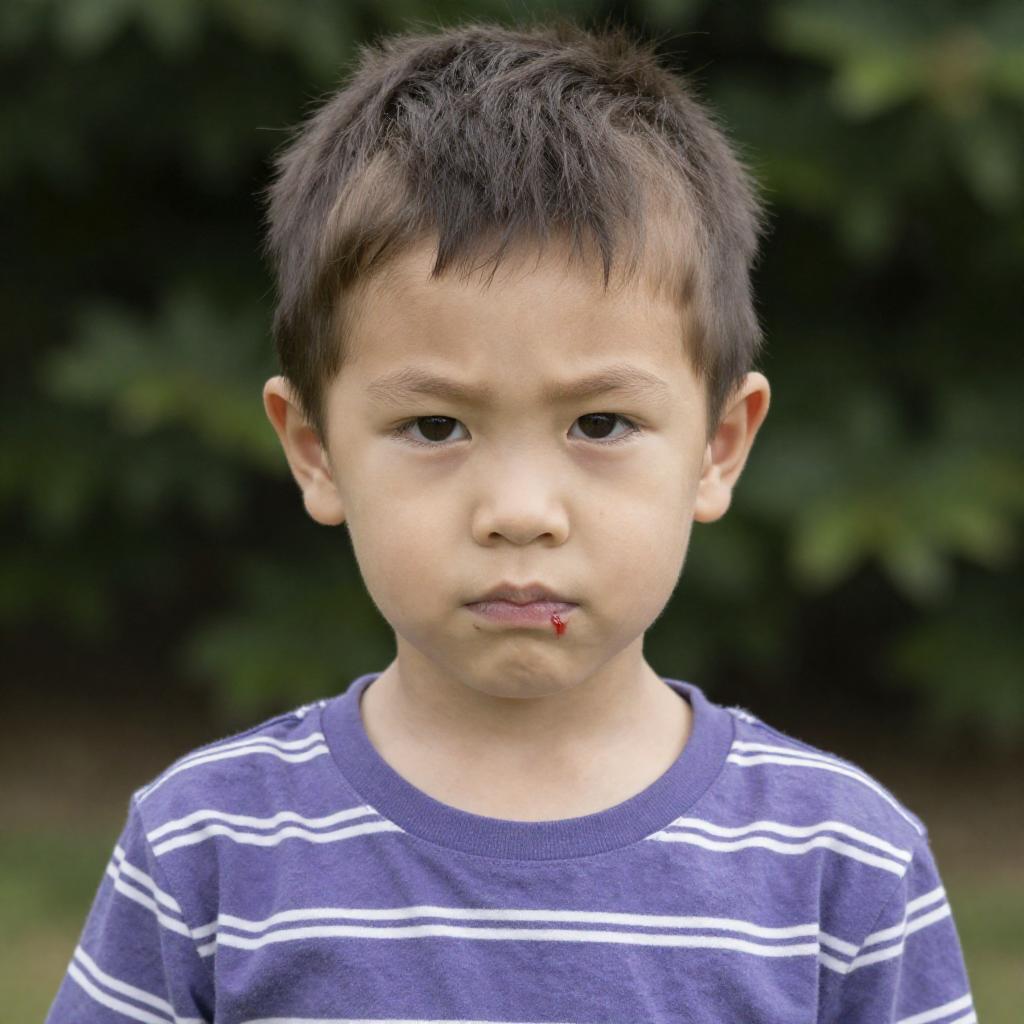Young boy with short brown hair, serious expression, small cut on lower lip, wearing purple-striped shirt, outdoors, blurred green foliage background.