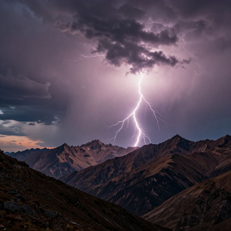 Darting lightning bolts striking a remote mountain landscape at dusk, dramatic stormy sky filled with rolling clouds, vivid illumination highlighting jagged peaks and turbulent atmosphere, cinematic and intense natural phenomenon.