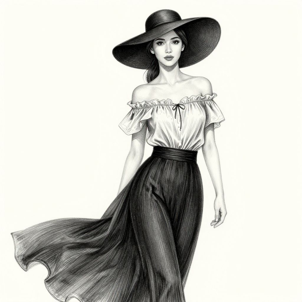 Elegant woman wearing a wide-brimmed black hat and flowing black skirt, paired with a delicate off-the-shoulder top, captured in a monochromatic pencil sketch style.