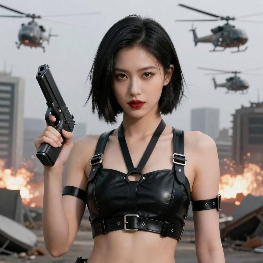 Asian woman with black hair in a ponytail, wearing a black sleeveless top and black cargo pants, kneeling on grass while holding a rifle. She has a focused expression. In the background, a car is engulfed in flames with thick smoke rising, a red swing set is visible, and a person lies on the ground in a suburban yard setting.