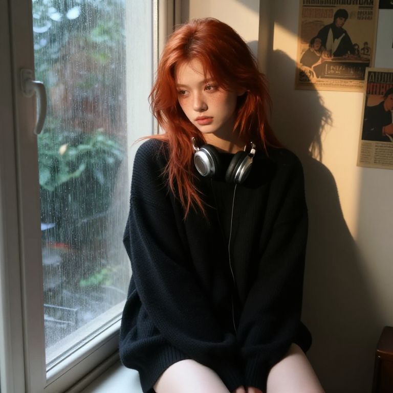 Emo girl with red hair sitting on a windowsill in a rain-soaked room, dressed in a black oversized sweater, headphones around her neck, melancholic expression, soft natural light casting shadows on her freckled face, vintage posters on the wall behind her