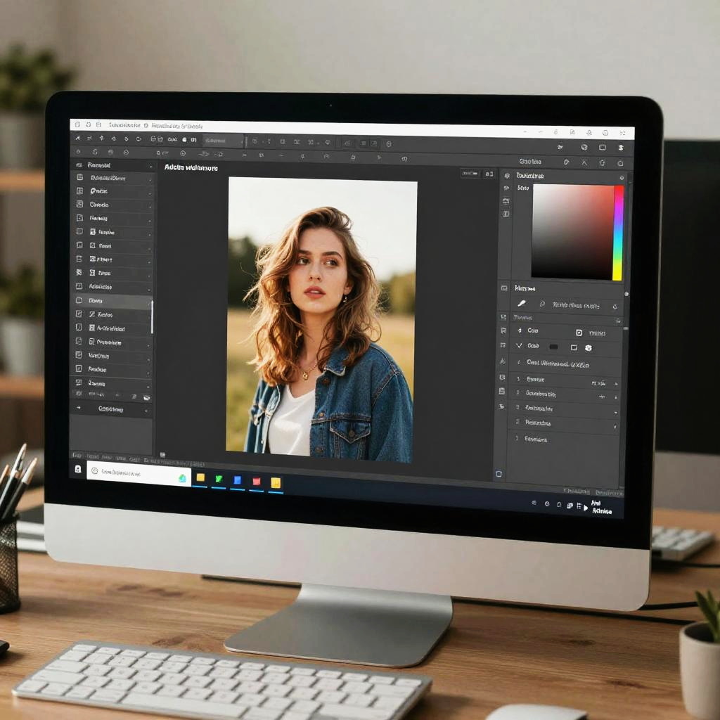 Adobe remove watermark process displayed on a computer screen, with intuitive interface, clear tools for seamless image editing, soft lighting, professional workspace background, high-resolution digital art style