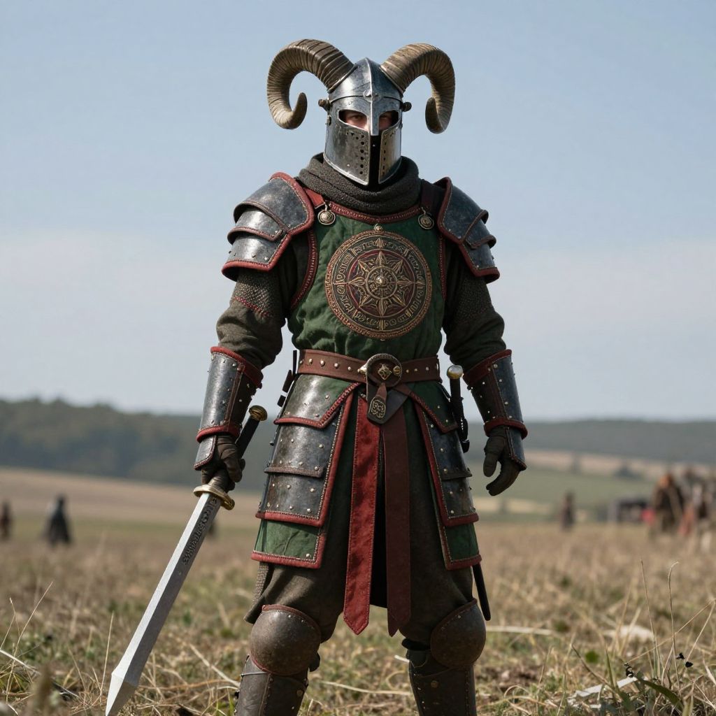 Mandala human a soldier wearing a green and red heavy armor, ram horns on his helmet. He has a weapon in each hand. He is in a field, during the day, sunny, clear weather. Medieval fantasy, dark,
