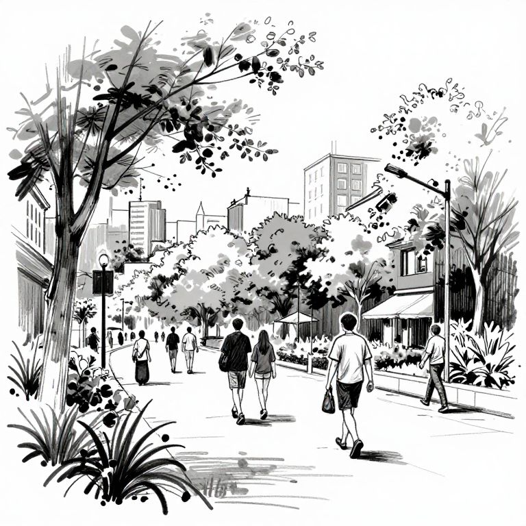 A black and white sketch of an urban space with people walking, trees, sculptures, and plants.