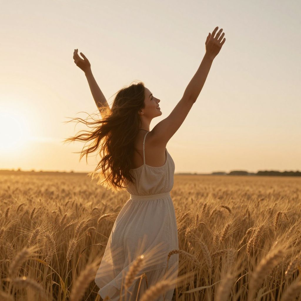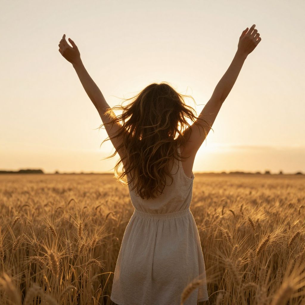Woman joyfully embracing freedom in a golden wheat field at sunset, her arms raised high as her flowing hair dances in the breeze.