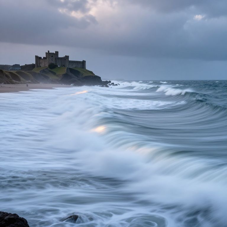 Wand a photo of a landscape with lots of waves, on the left there is the coast with waves splashing and a castle, stormy weather, photorealistic, long time exposure, morning lights,