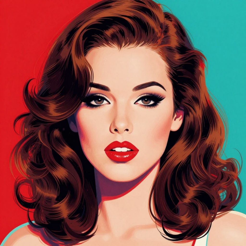 Digital illustration of a woman with fair skin and dark, wavy hair standing on a sandy beach. She wears a red, halter-neck swimsuit that accentuates her hourglass figure and medium-sized breasts. Her red lipstick matches her swimsuit, and she has a confident expression. The background features a clear blue sky with a few white clouds, and a calm, blue ocean with gentle waves. The sand is light beige, adding contrast to the vivid colors of her swimsuit and the sky. The illustration style is reminiscent of vintage pin-up art with bold, flat colors and clean lines.