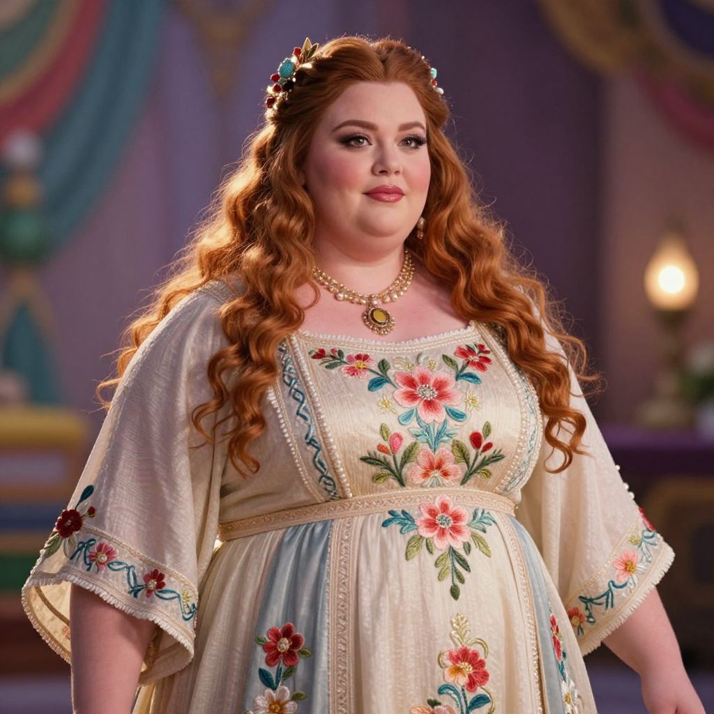 Photograph of a plus-sized white woman with long, wavy red hair adorned with a floral headpiece. She wears an off-the-shoulder, cream-colored dress with colorful floral embroidery, including red and pink flowers with green leaves. The dress has a wide, fabric belt and delicate blue and gold trim. She has fair skin, rosy cheeks, and wears a gold necklace with a circular pendant. The background is softly blurred, featuring purple and blue draped fabrics with warm lighting, suggesting a fairytale or historical setting. The image focuses on her upper body, capturing her confident and gentle expression.