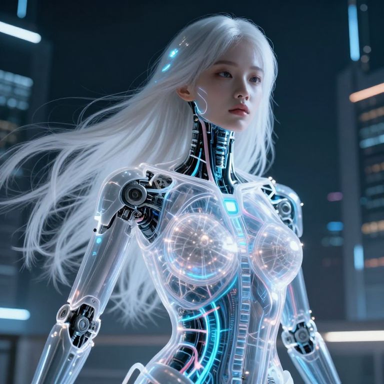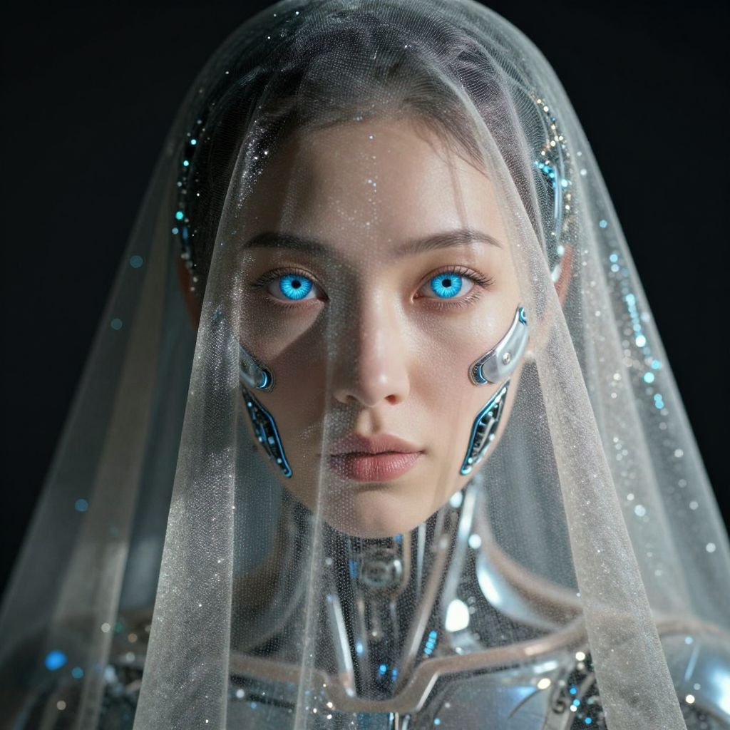Digital art of a futuristic, blue-eyed woman with glowing cybernetic features, wearing a transparent veil and silver armor, set against a dark background.