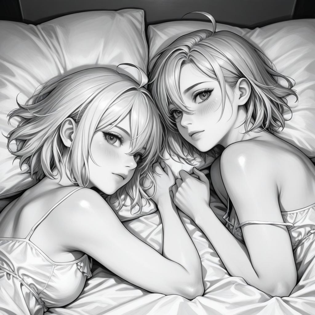 Digital artwork featuring an anime-style young woman with short brown hair and a red hair clip, lying on a bed with white sheets. She is wearing a black sweatshirt with red text, a grey plaid skirt, and black tights. The scene includes several white-gloved figures interacting with her in a softly lit room with windows in the background.