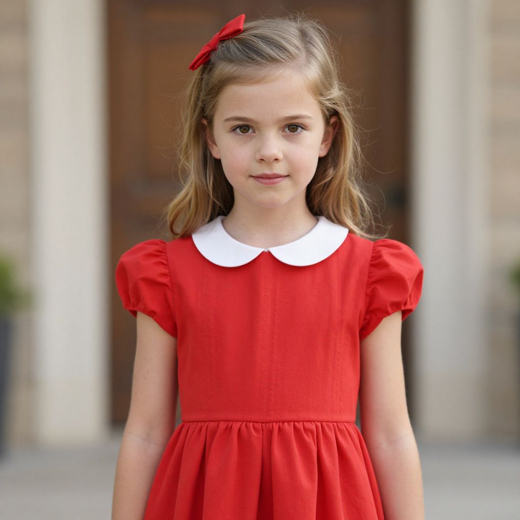 Girl Penny Proud Costume Dress, a close up of a young girl in a red dress standing in front of a building