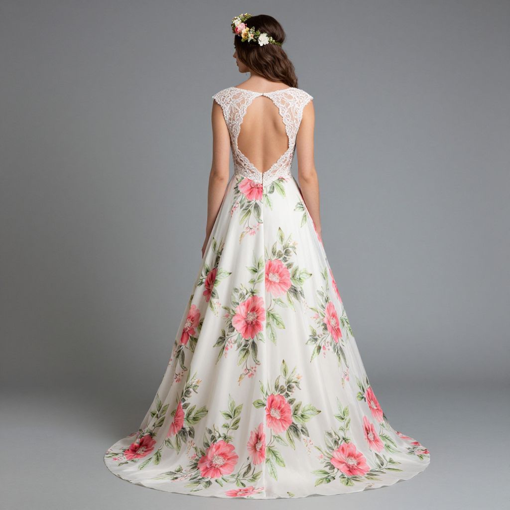 Back view of a woman wearing a floral bohemian A-line wedding dress featuring an open back with intricate lace detailing, complemented by a floral crown and a flowing skirt adorned with vibrant pink and green floral patterns.