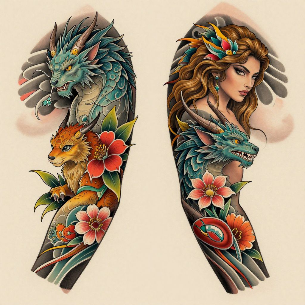 Full sleeve tattoo designs drawings women, vibrant and colorful mythical creatures entwined with natural elements like flowers and leaves, dynamic composition, smooth gradients, elegant and fierce, digital art style with fine detailing and soft shading, emphasizing strength and beauty.