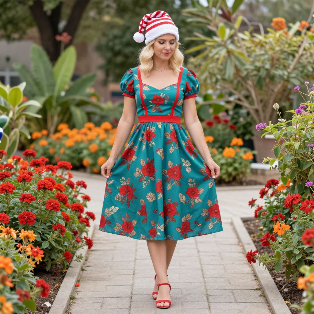 Blonde woman wearing a teal dress with red floral patterns, short puffed sleeves, red trim, and a red and white striped Santa-style hat with a white pom-pom. She stands on a paved stone pathway surrounded by bright red and orange flowers and lush green plants in a colorful garden under soft natural lighting on a sunny day.