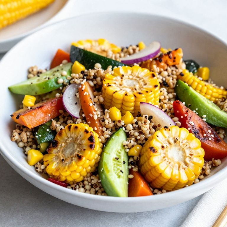 Golden sweet potato cubes, interspersed with vibrant yellow corn kernels and savory bacon bits, are artfully piled high on a pristine white plate, crowned with a dollop of creamy yogurt garnished with fresh green chives.