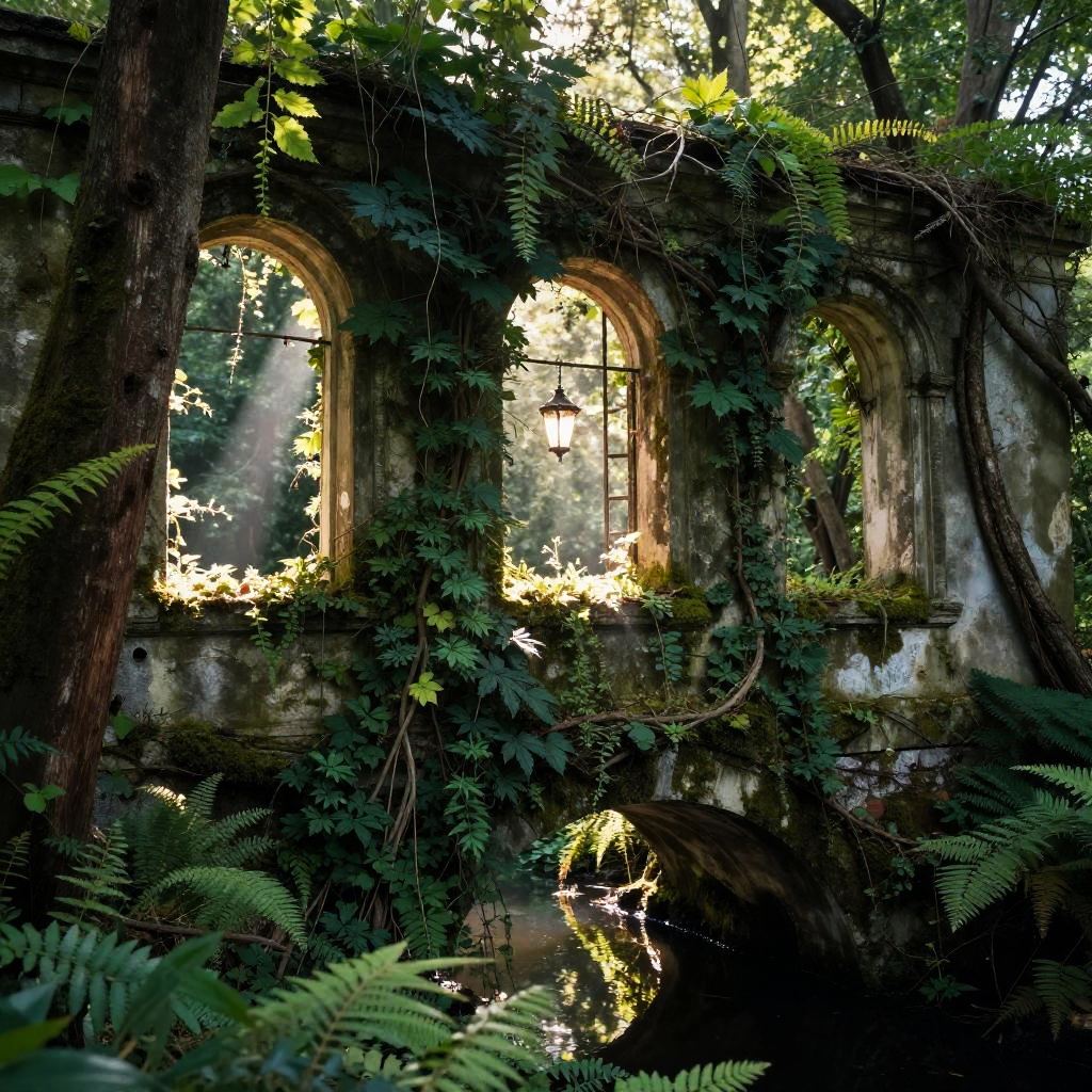 Scenery, no humans, tree, outdoors, nature, plant, fantasy, vines, overgrown, forest, sunlight, building, bridge, moss, day, light rays, water, ruins, lantern, light, window, arch