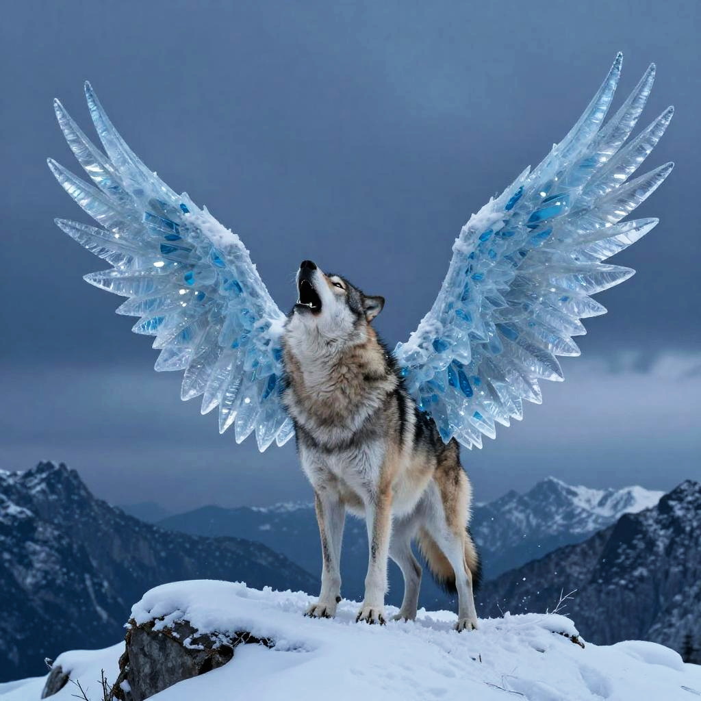 Add wings to photo of a lone wolf howling on a snowy mountain peak, massive translucent blue ice wings extending with shimmering crystalline patterns, cold winter landscape, deep twilight tones evoking mysticism and power in nature.