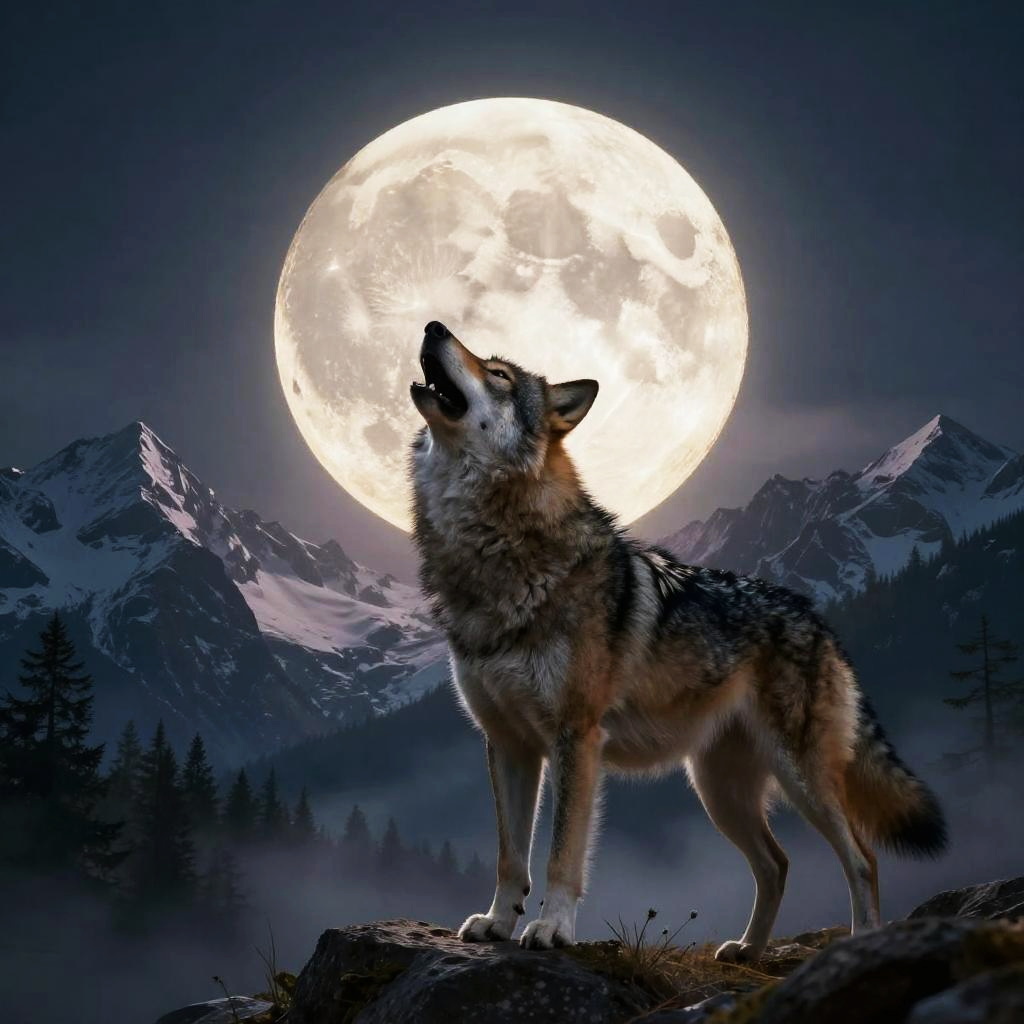 Photograph of a wolf with blue ice wings standing on a snowy mountain, howling under a cloudy, blue-gray sky.