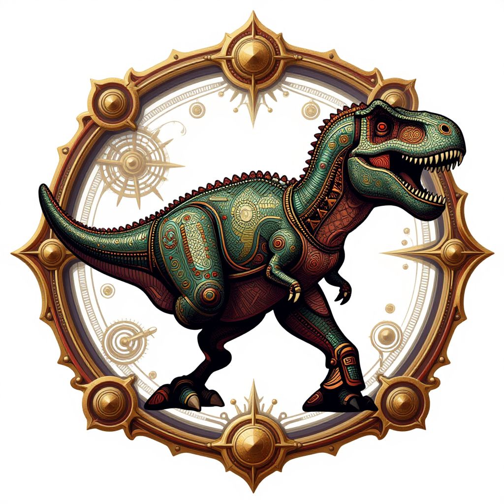 Overhead Steampunk style icon design featuring a t-rex, intricate details, vibrant colors, elegant aesthetic, inspiring, awe-inspiring, detailed, intricate, white background,