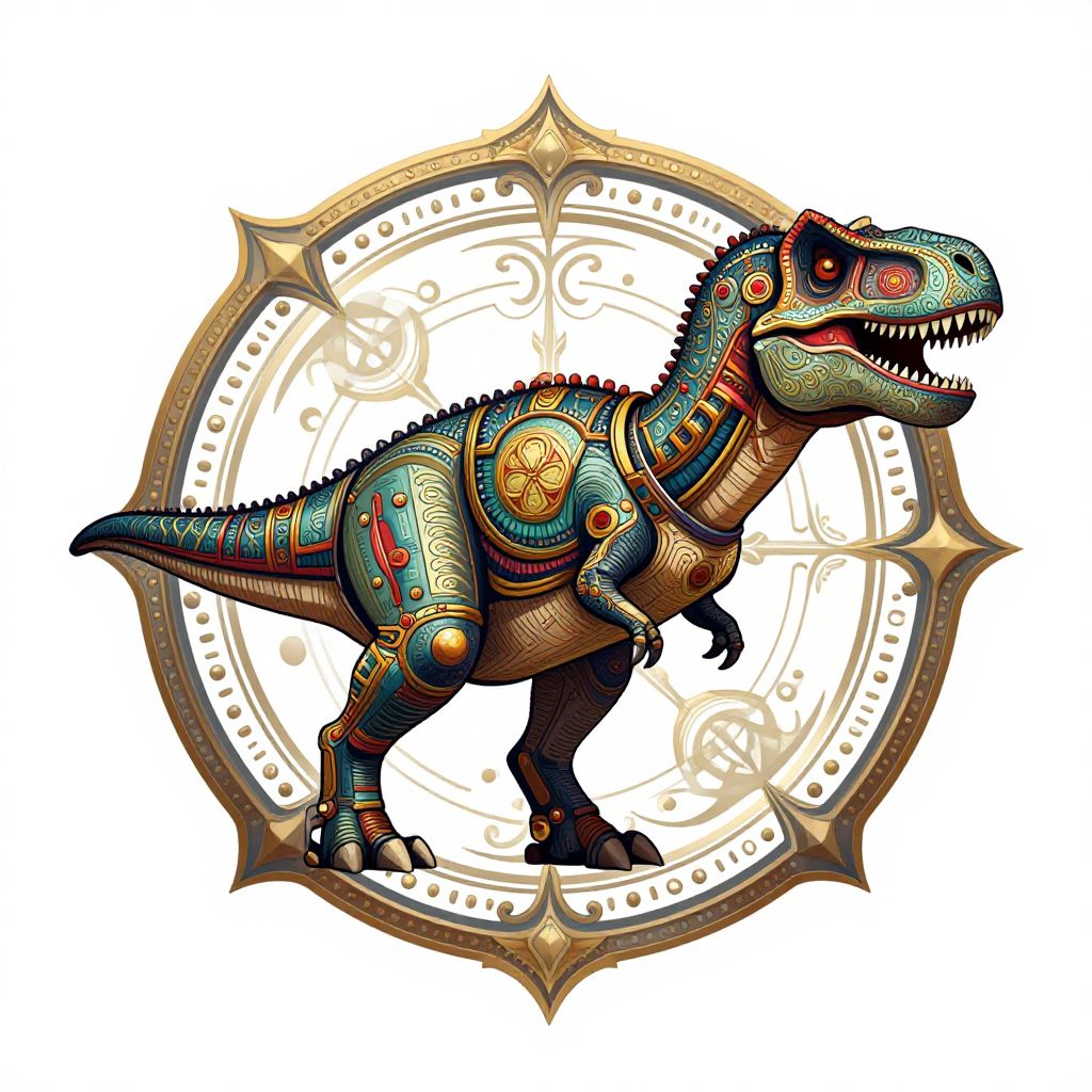 Colorful, detailed, stylized dinosaur with intricate tribal patterns, set against a gold, circular, ornate background in digital art.